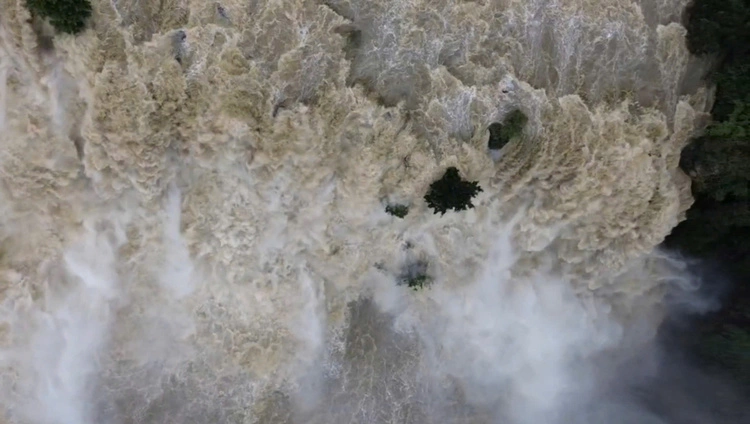 Thác Pongour chảy xiết, cuốn trôi nhiều tiểu cảnh khi nước lũ đổ về mạnh do mưa lớn, ban quản lý phải tạm dừng đón khách từ chiều 18/11.