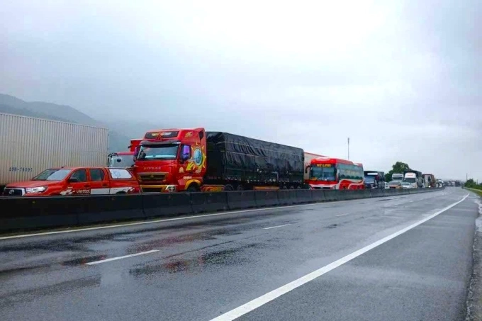 Đoàn xe ùn ứ do tạm đóng chiều Nam ra Bắc trên quốc lộ 1 qua xã Công Hải. Ảnh: CSGT