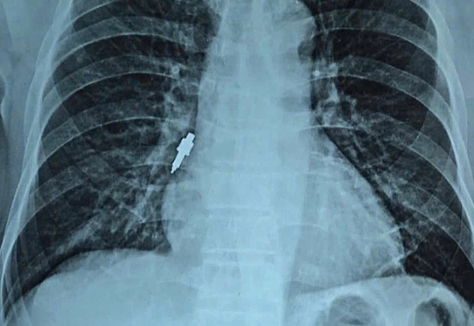 Dị vật kim loại nằm sâu trong đường thở. Ảnh: Bệnh viện cung cấp