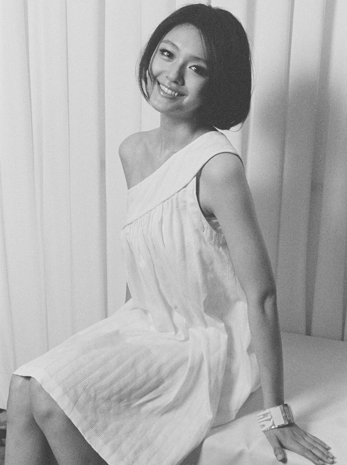Nhiếp ảnh gia chụp bằng máy ảnh Canon EOS 5 kết hợp film Kodak Tri-X 400. Hy Viên mặc váy trắng lệch vai,tóc ngắn,luôn mỉm cười trước ống kính.