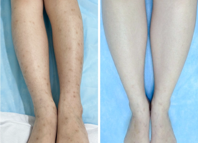 Sau 2 tuần điều trị,tình trạng viêm giảm dần,các nốt mụn xẹp xuống. Tuy nhiên,trên da còn nhiều vết thâm sau viêm,đặc biệt ở vùng lưng và chân. Bác sĩ chỉ định điều trị thêm bằng laser pico 6-10 lần,2 tuần một lần,nhằm làm mờ sắc tố và phục hồi bề mặt da.