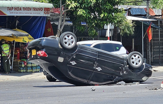 Khánh Hòa- Xe 4 chỗ chở ba người chạy trên đường Nguyễn Tất Thành, tông dải phân cách rồi lật ngửa sang làn ngược chiều, chiều 15/4.